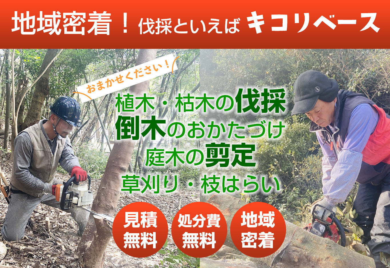キコリベースのスタッフが直接ご自宅にお伺いしお見積もりする際、条件が整えばその場で即伐採も可能です。伐採した樹木の処分費は無料です。スタッフが帰るときにはお庭はさっぱりきれいな状態です。